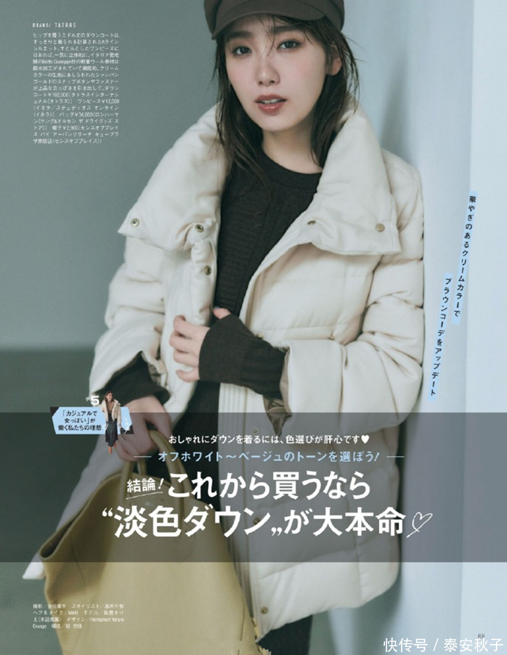 我们可以准备一件保暖力十足的羽绒服,在里面叠穿白色+棕色的打底,配色更清新自然,显白显青春。