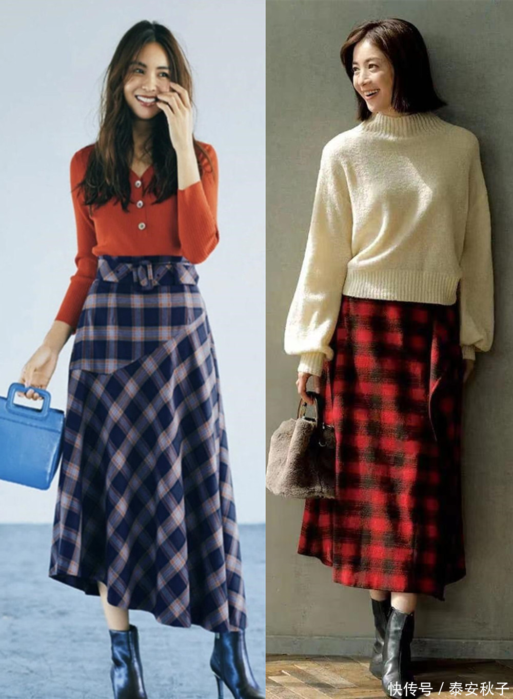复古格纹半身裙,带着一丝复古摩登的气息,与纯色调的羊毛衫相互结合,既能保暖、又能增添时尚感。